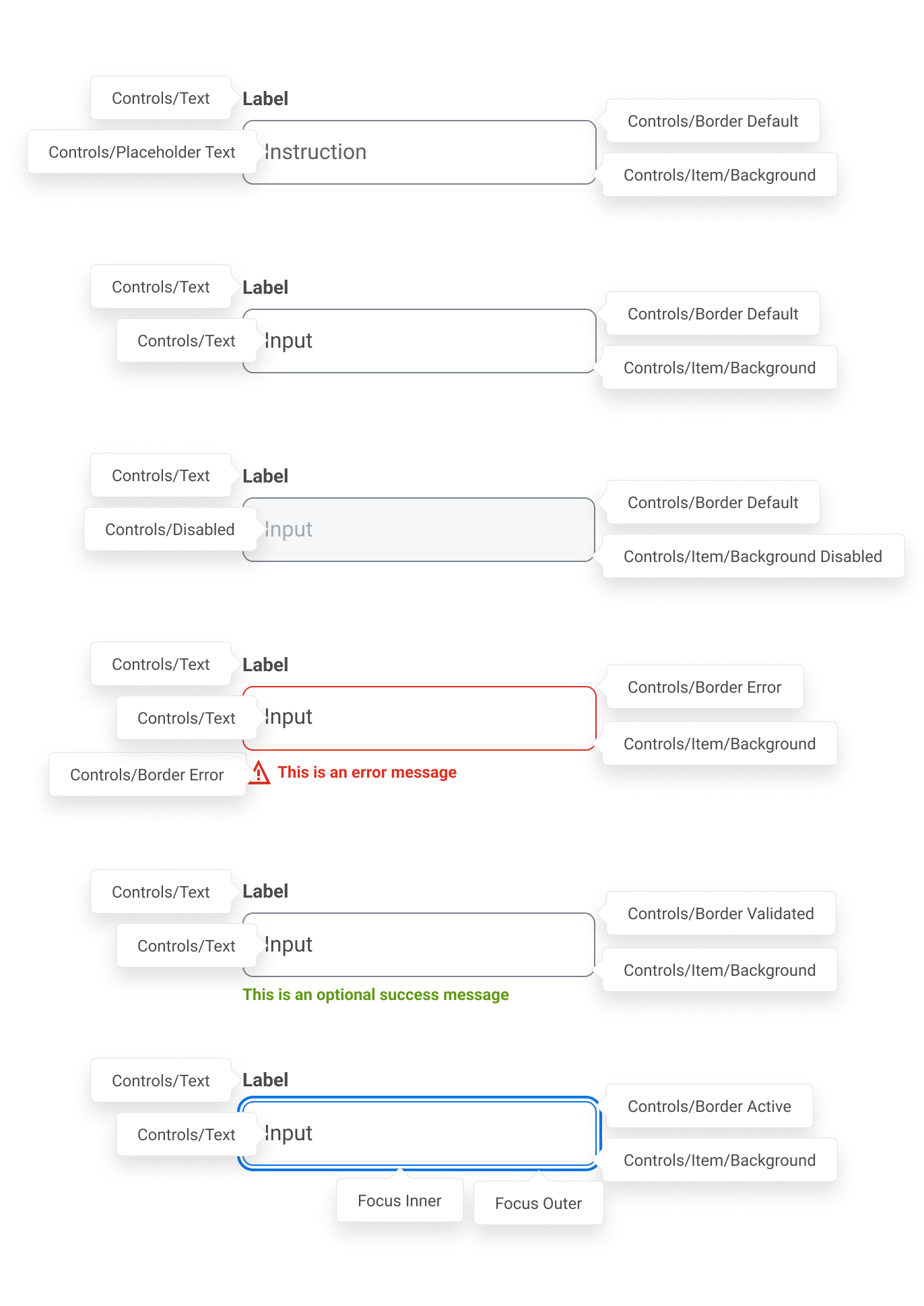 Our form controls share these purpose colors. For example, the inputs, selects, checkboxes, radio buttons, etc. all have the same border, the same background color, the same selected-marker.