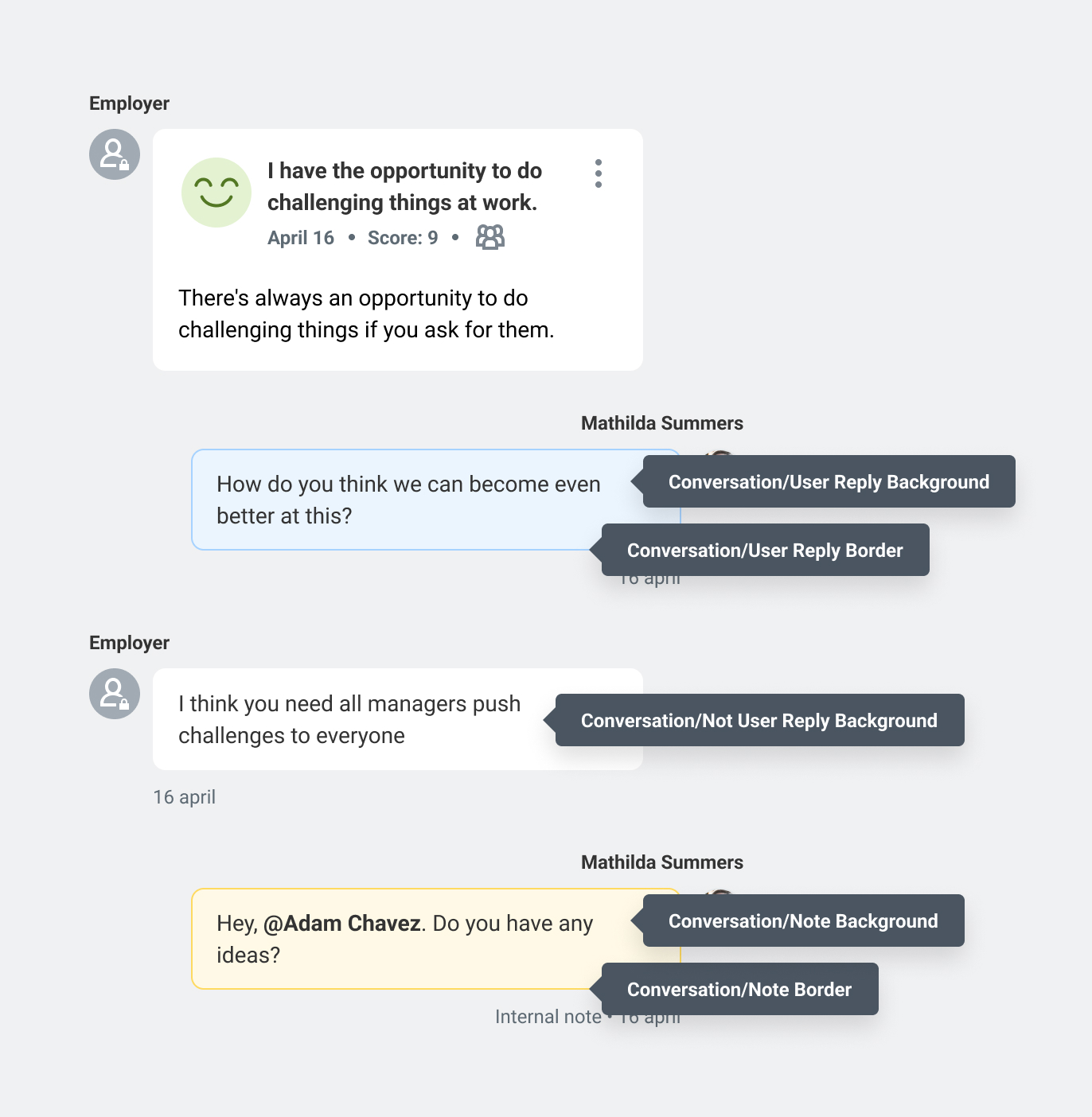 The conversation colors are used to tell the difference between a reply, the user's own messages, and notes - an internal discussion feature between managers.
