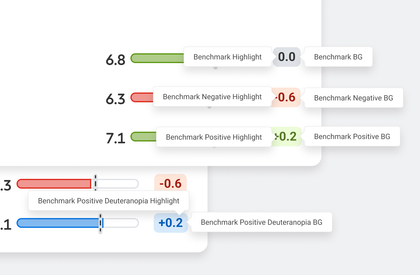 The colors below are reserved for score and difference to benchmark related charts.
