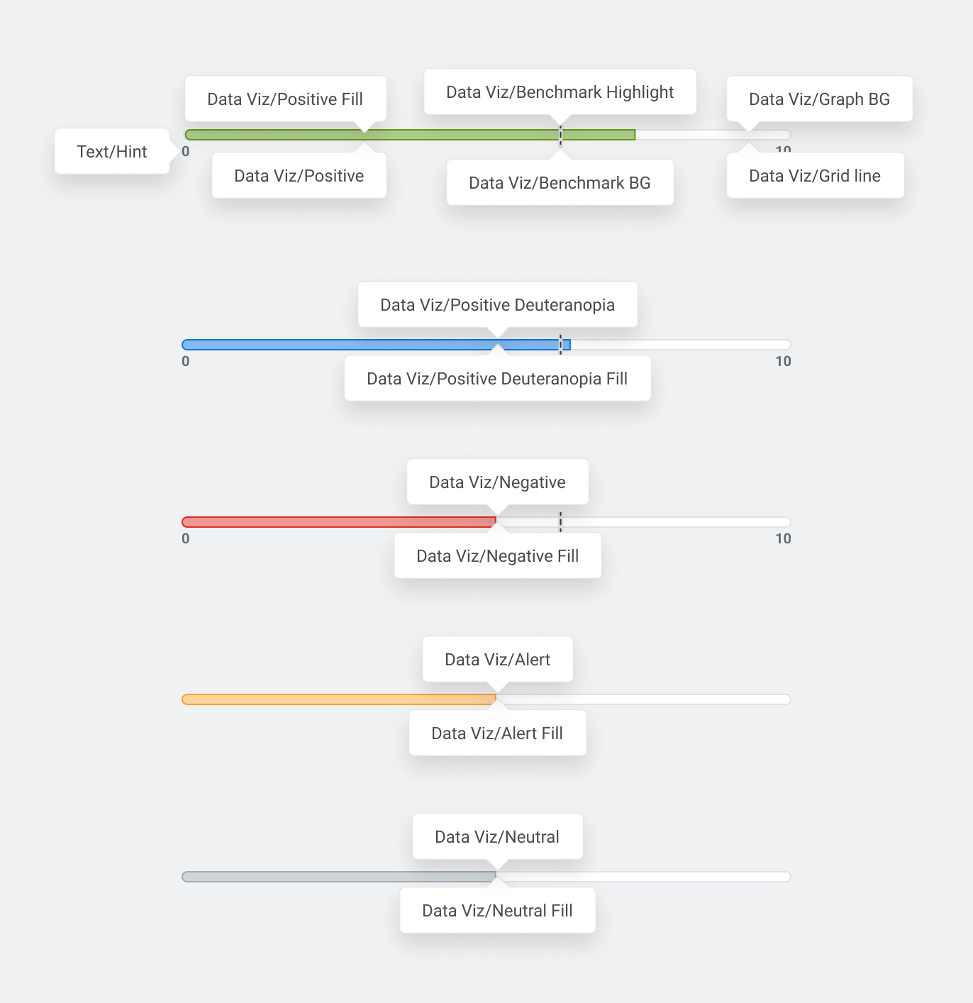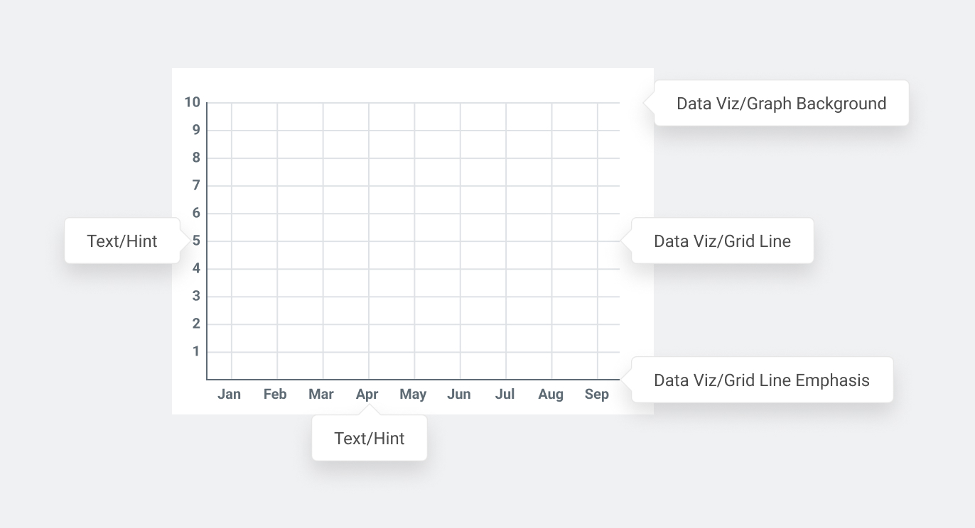Used to build the grids behind our charts. Grid Line is for the lighter strokes, and Grid Line Emphasis is for the Axis lines or the zero-line.