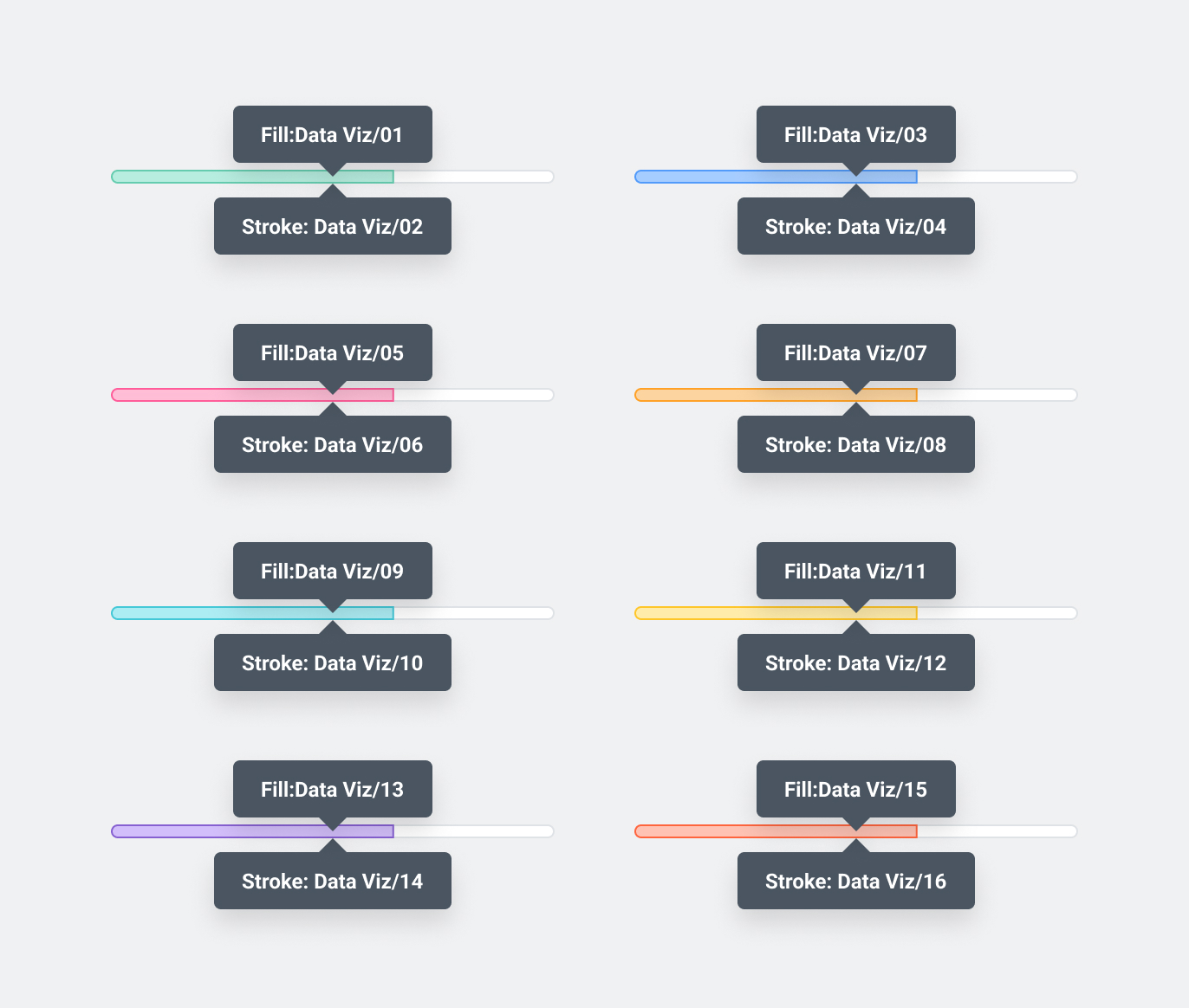 Use in pairs, eg. Use color-viz-05 for the fill on the bar chart bar, and color-viz-06 as the stroke.