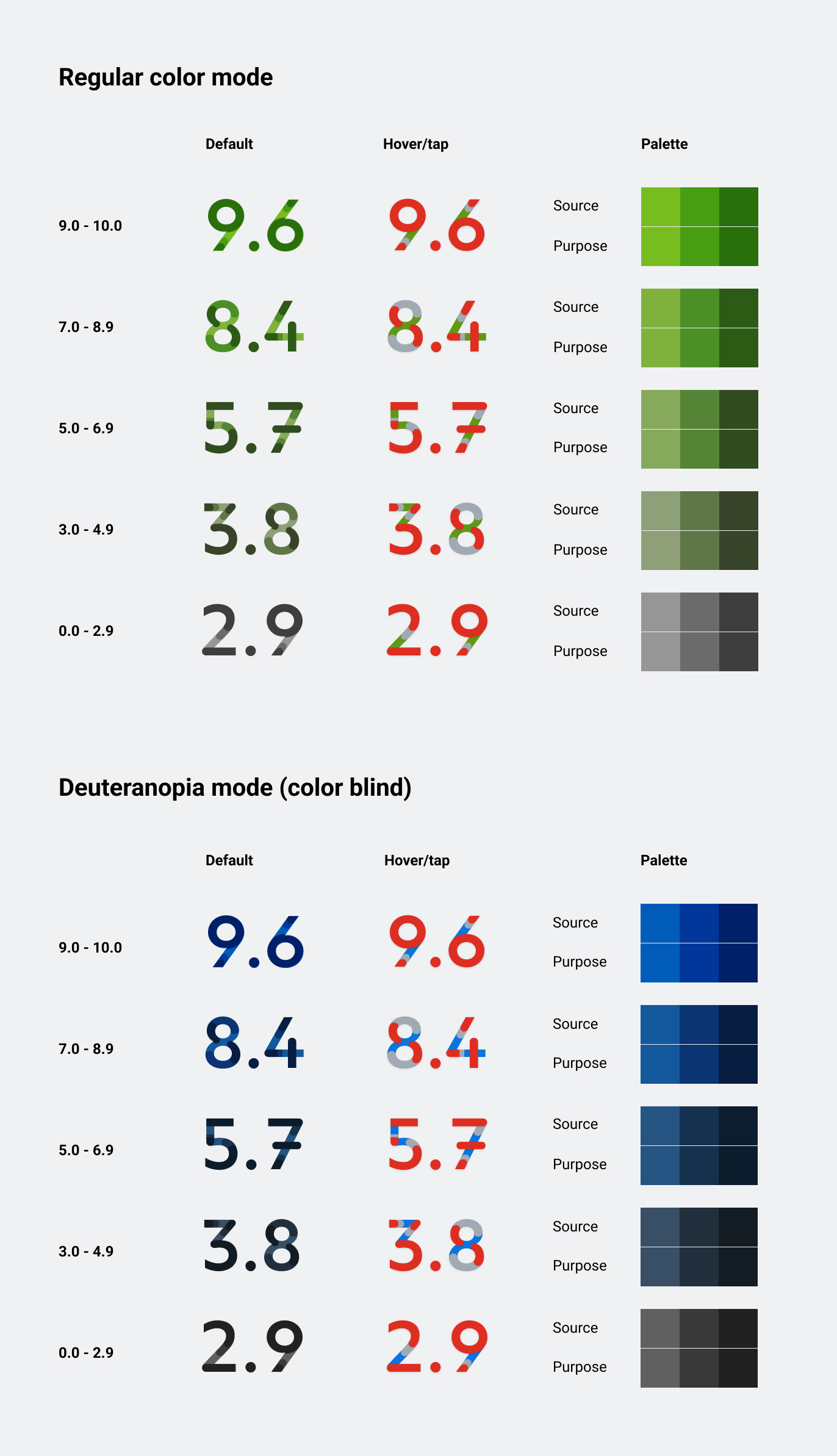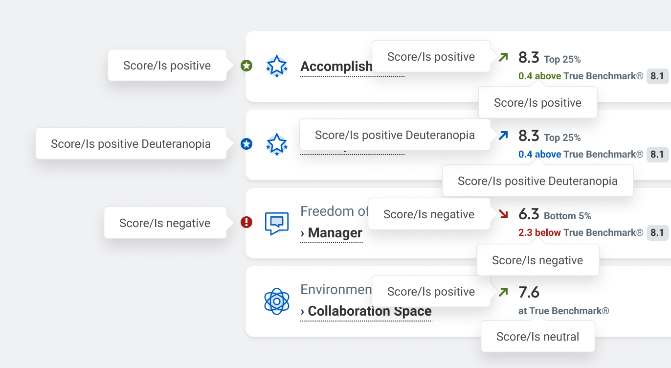 All green score colors have a blue backup for users with red-green color blindness. See Deuteranopia