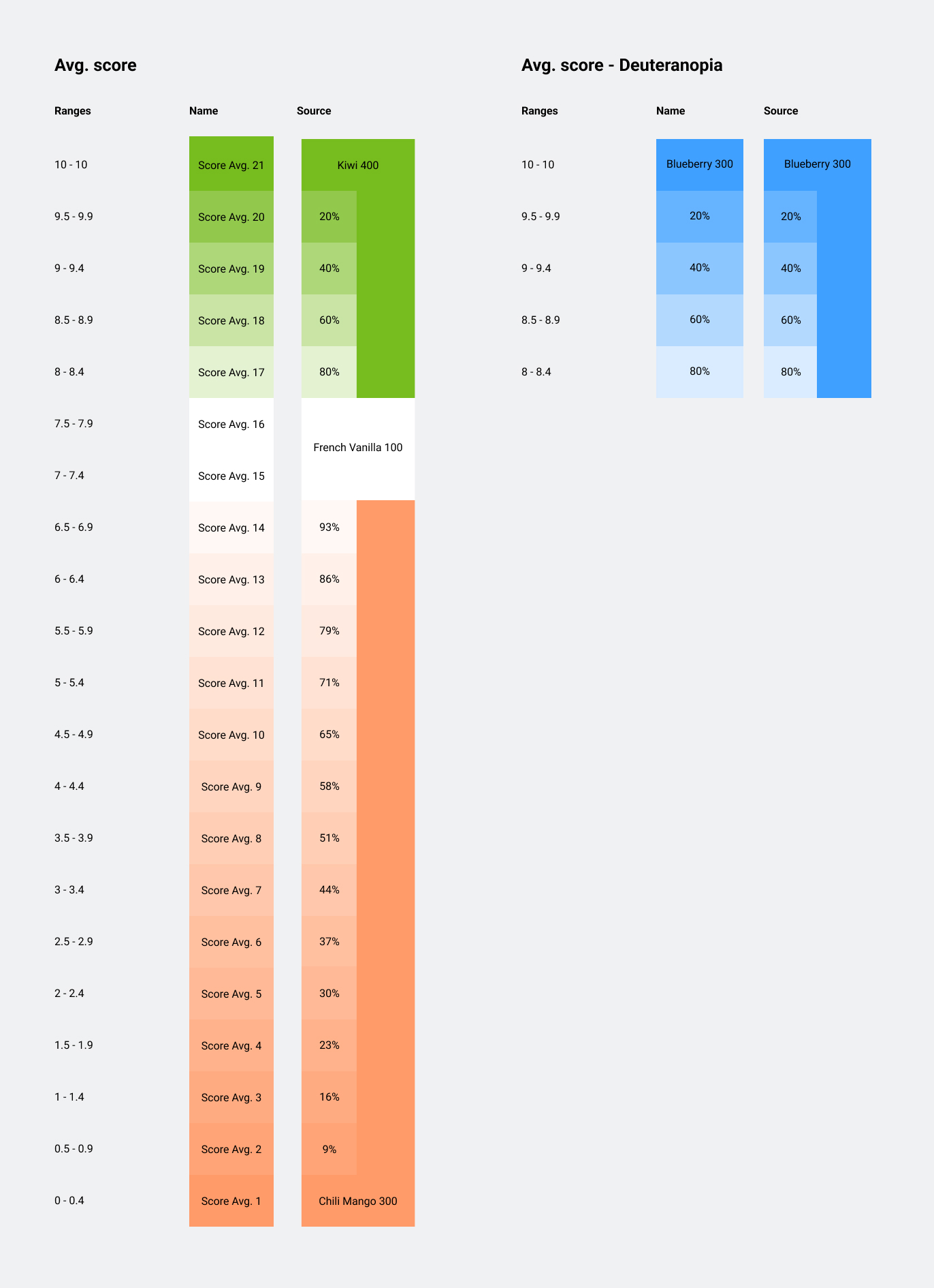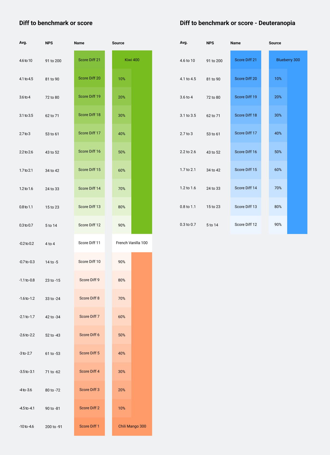 Currently used on the Heatmap when the score-toggle is set to Average. This range is offset as any score below 7.0 is considered negative and any score above 8.0 is considered positive. 21 steps, 15th and 16th (7.0-8.0) is neutral/white.
