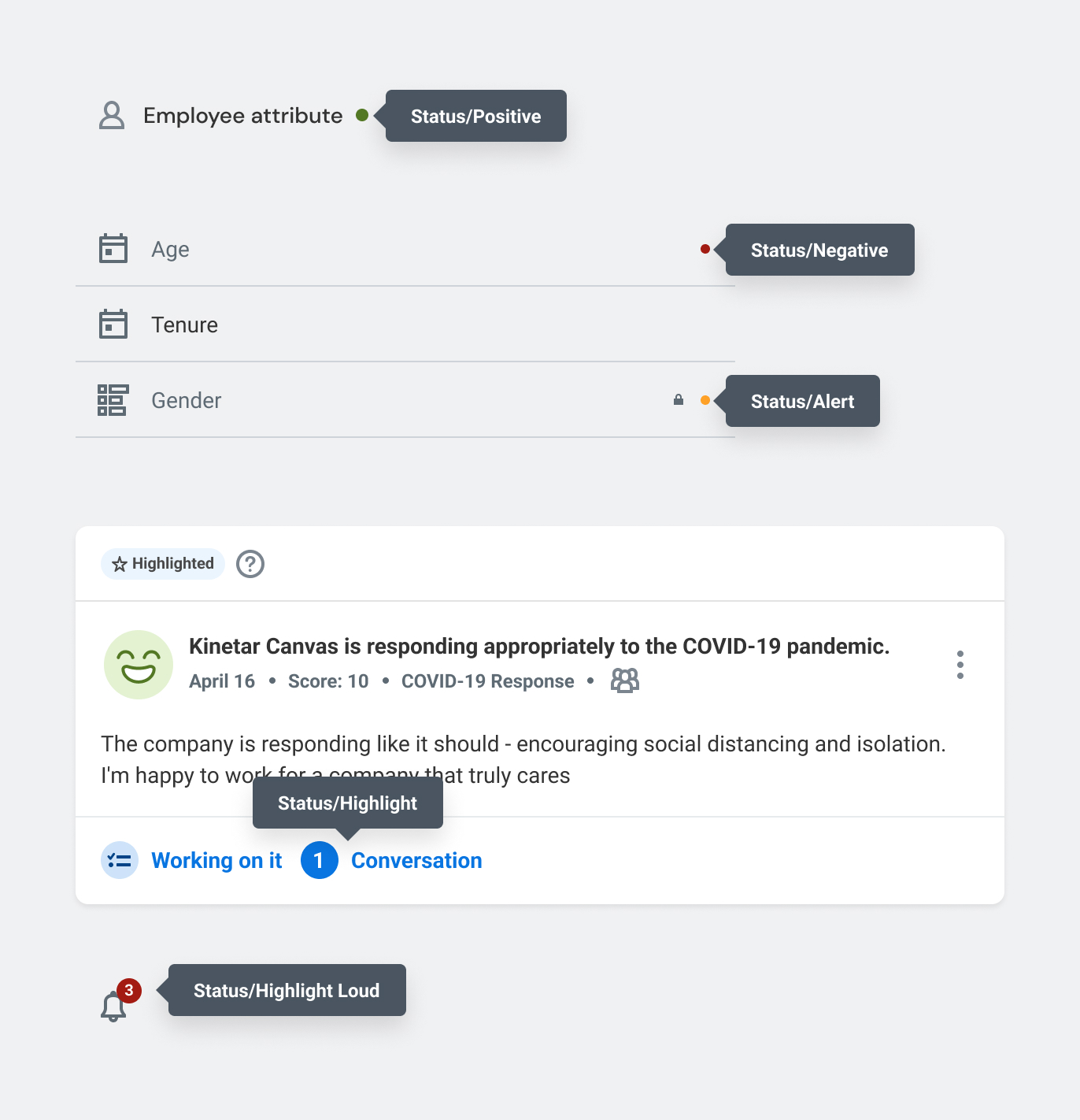 Used to indicate statuses. Like On/Off for an attribute, Positive/Alert/Negative for privacy settings on sensitive attributes.